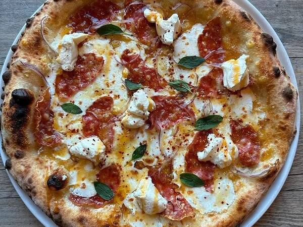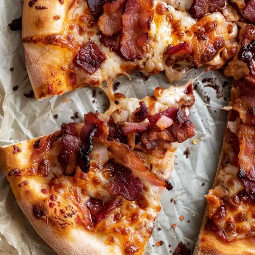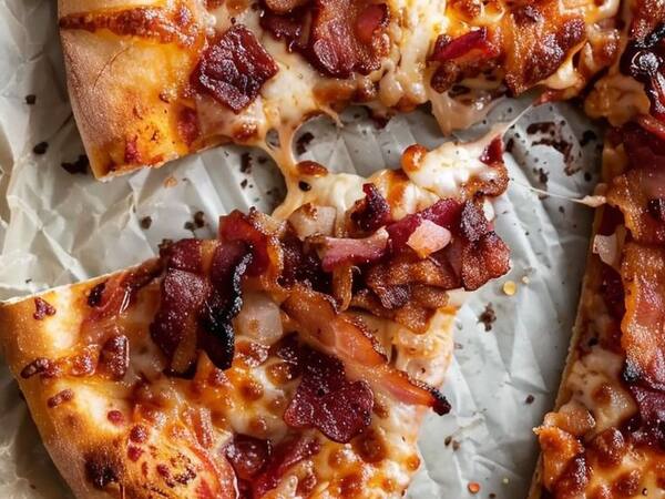 Molho, Muçarela, Calabresa, Bacon, Milho, Cebola, Tomate, Azeitona e Orégano