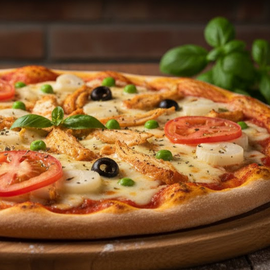 Molho, Muçarela, Frango Desfiado, Palmito, Ervilha, Tomate, Azeitona e Orégano. (Imagem meramente ilustrativa)