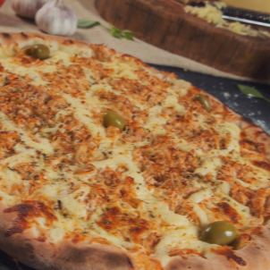 Molho, Muçarela, Frango Desfiado, Cebola, Tomate, Azeitona e Orégano