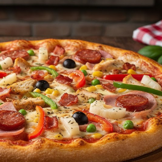 Molho, Muçarela, Presunto, Calabresa, Bacon, Frango, Ervilha, Milho, Palmito, Abacaxi, Pimentão, Tomate, Azeitona e Orégano. (Imagem meramente ilustrativa)