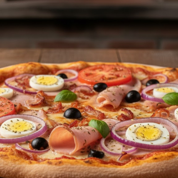 Molho, Muçarela, Lombo Canadense, Bacon, Presunto, Cebola, Ovos, Tomate, Azeitona e Orégano. (Imagem meramente ilustrativa)