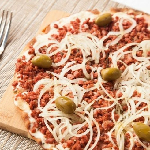 Molho, Muçarela, Calabresa Moída, Pimenta Calabresa, Cebola, Tomate, Azeitona e Orégano