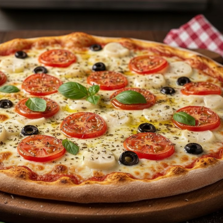 Molho, Muçarela, Palmito, Molho de Tomate Especial, Tomate, Azeitona e Orégano
