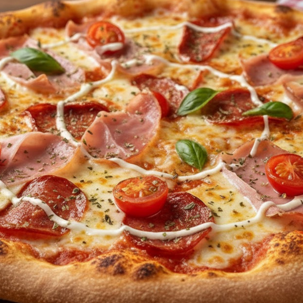 Molho, Muçarela, Presunto, Calabresa, Creme de Leite, Tomate e Orégano Molho, Muçarela, Presunto, Calabresa