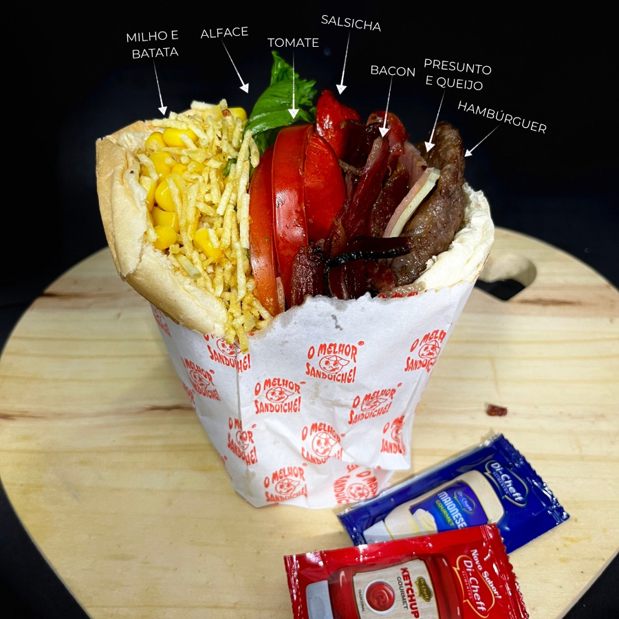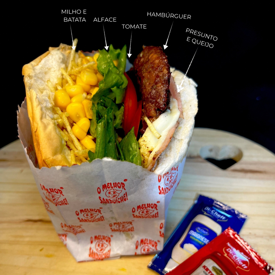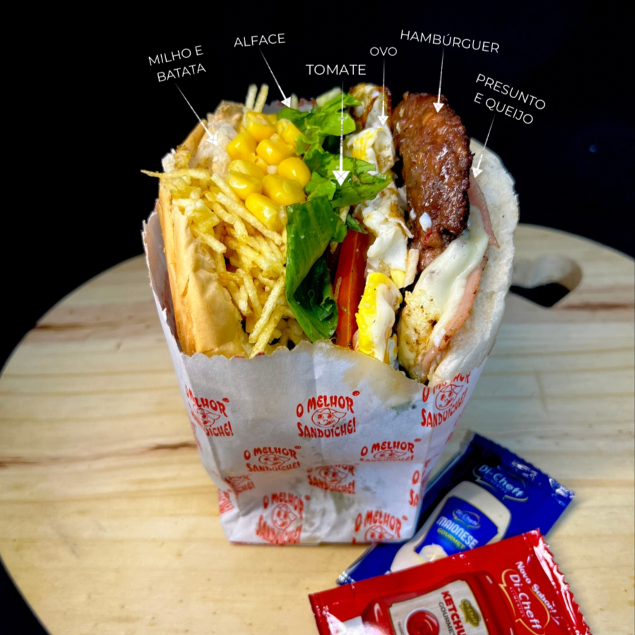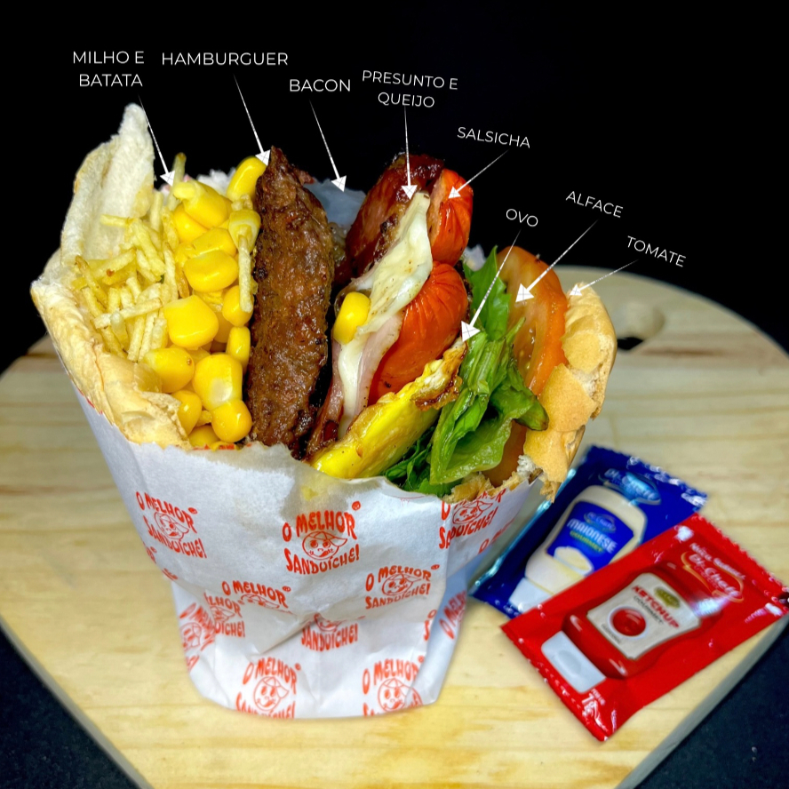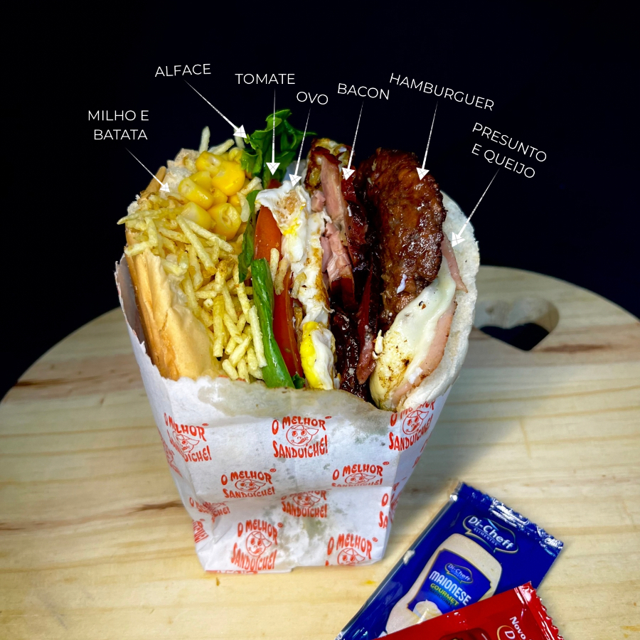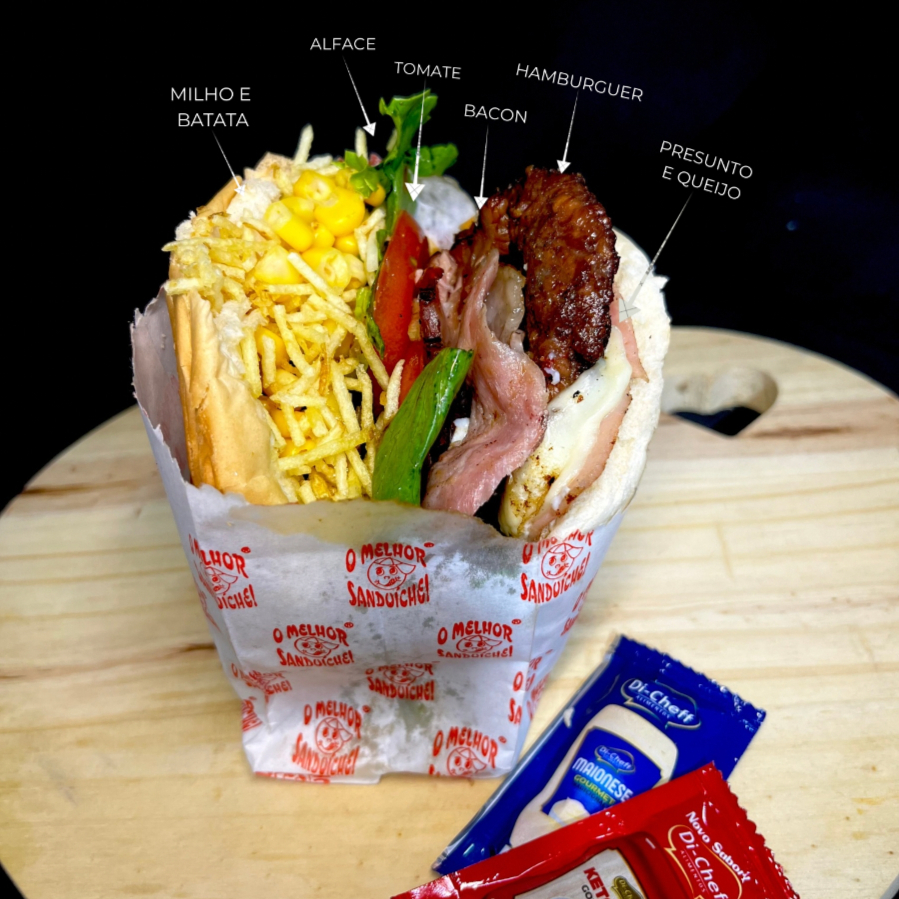 Pão, hamburguer, presunto, mussarela, salsicha, bacon, tomate, alface, milho e batata palha