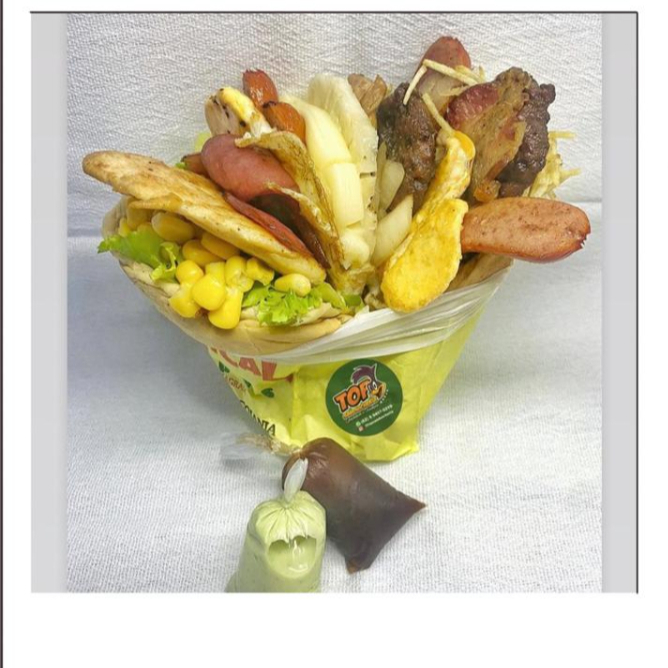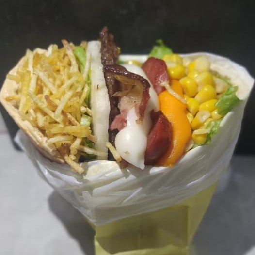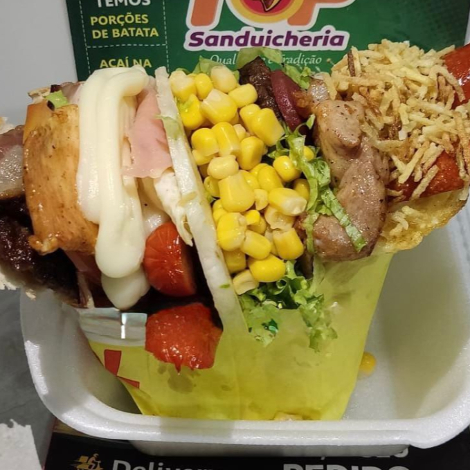Pão, 2 hambúrguer,frango, lombo, calabresa, bacon,2 Ovos, 2 salsichas,presunto, mussarela, alface,tomate,milho, batata e Catupiry