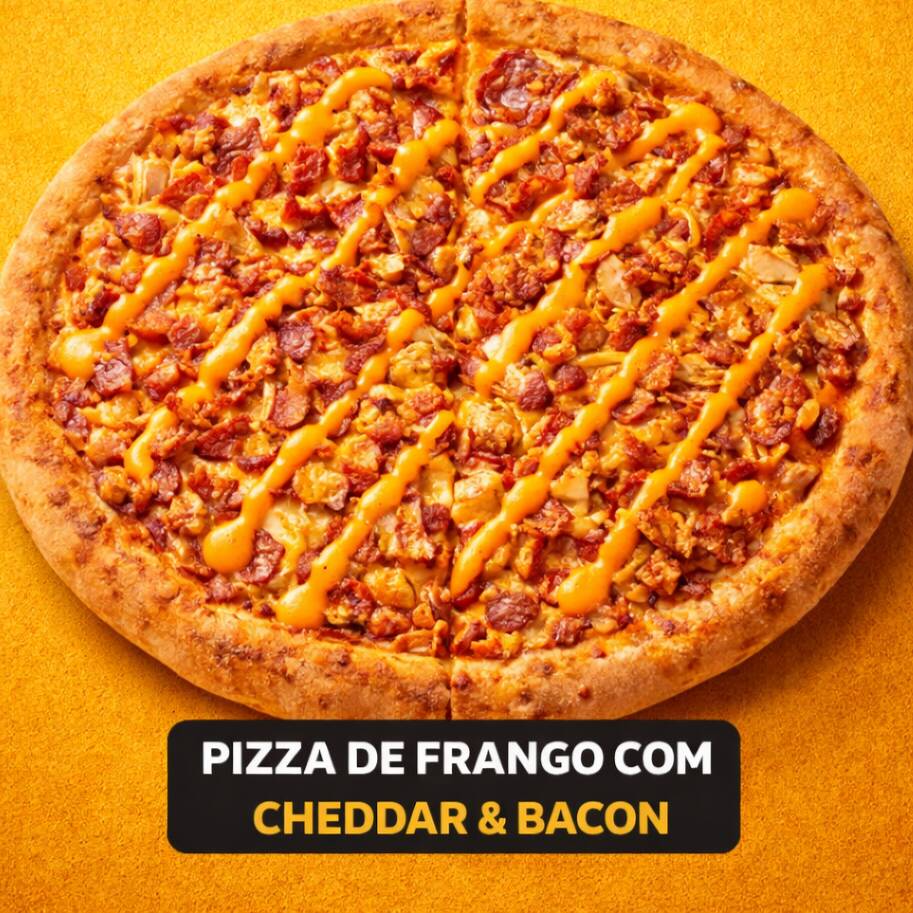 Frango suculento, cheddar cremoso e bacon crocante, finalizados com mussarela
