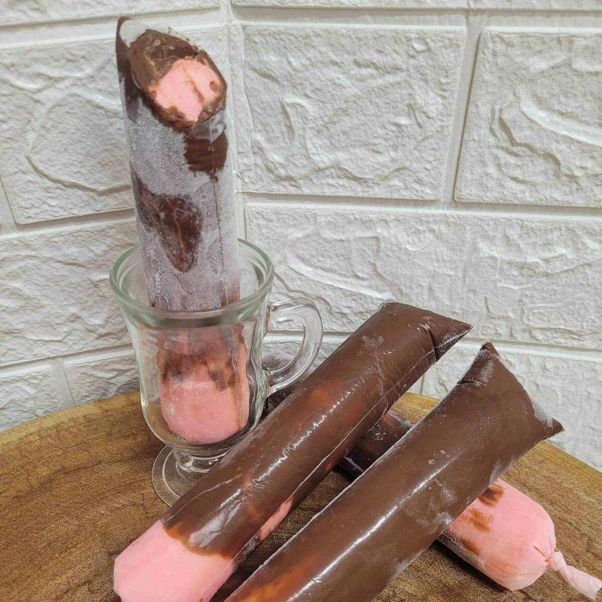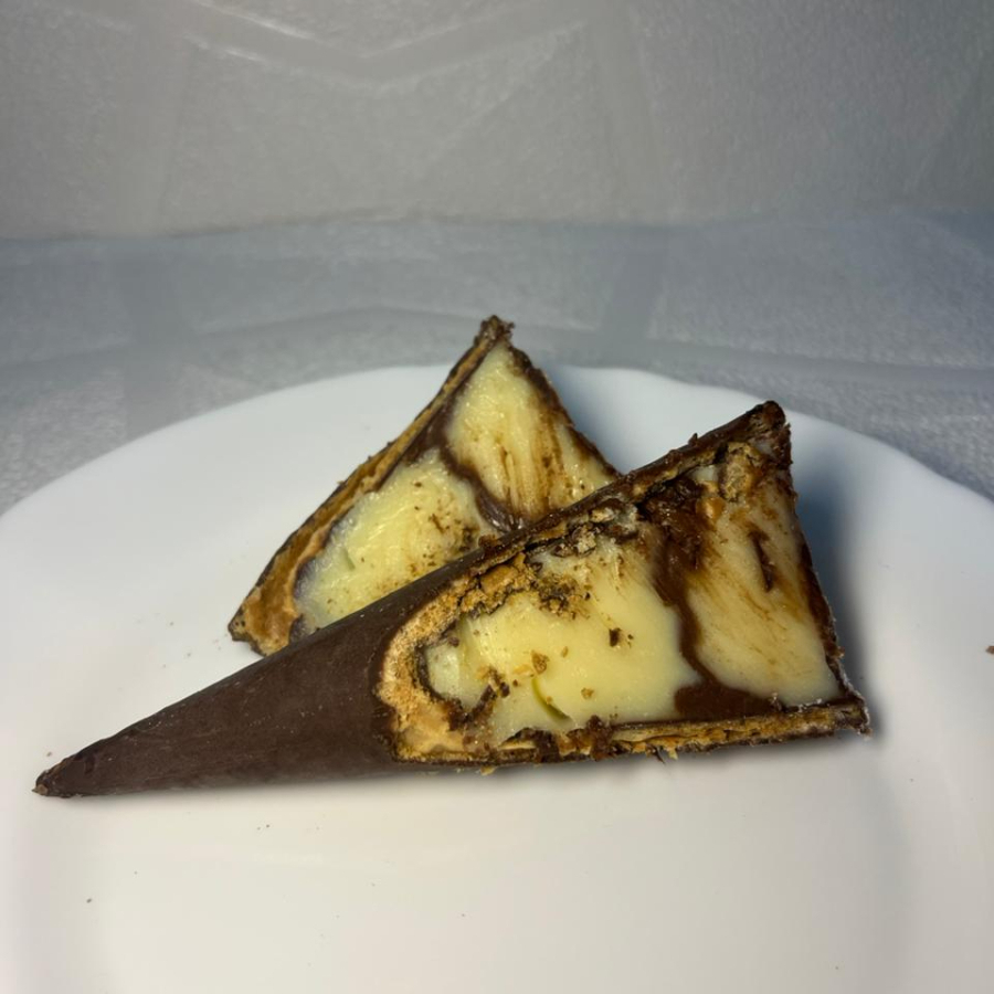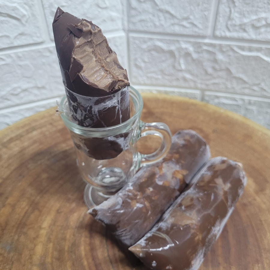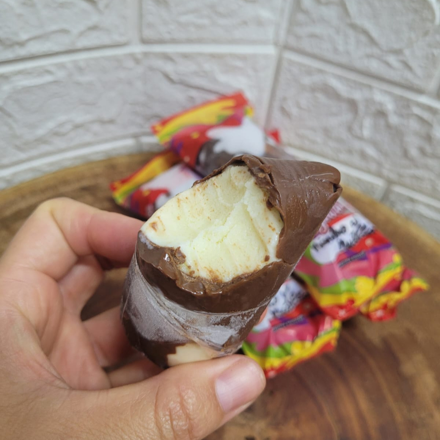 Um delicioso e cremoso geladinho de coco com casquinha de chocolate.