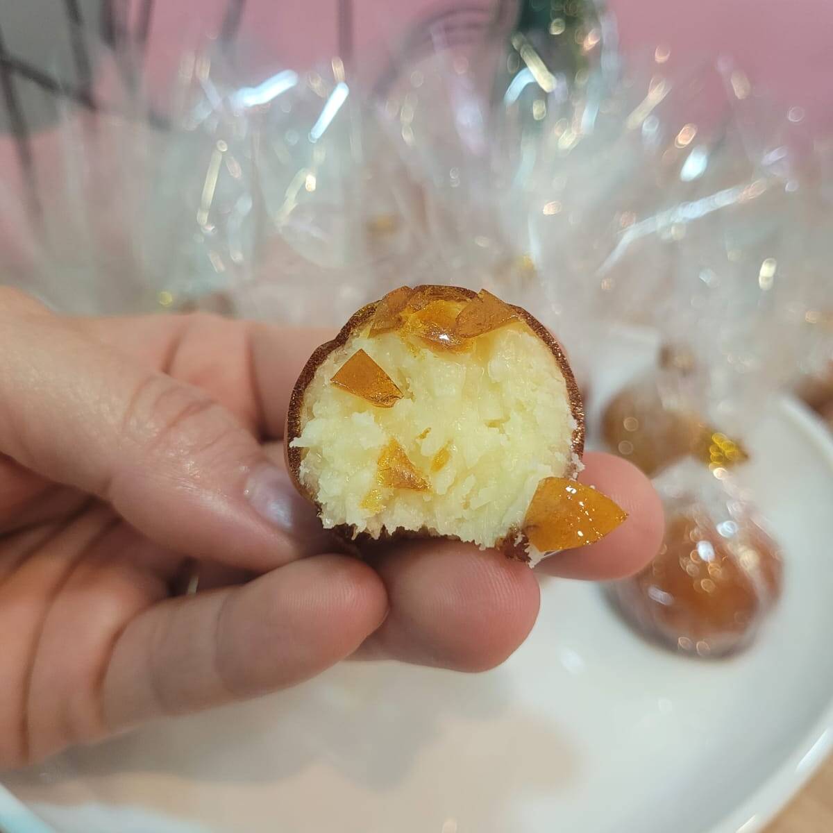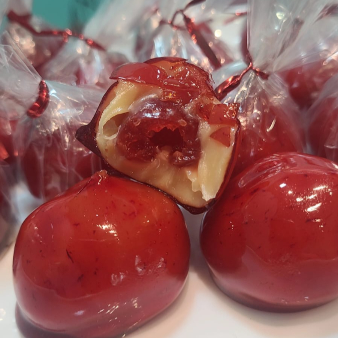 Brigadeiro de ninho com uma Cereja dentro e banhada no caramelo crocante sequinho , que não gruda no dente.