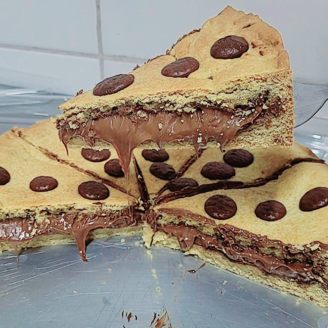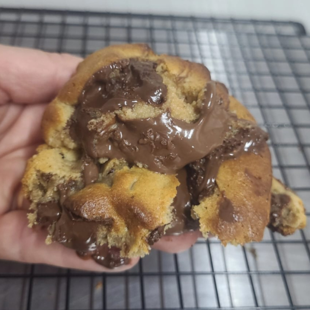 Massa de cookies tradicional com gotas de chocolate ao leite e bem recheado cm uma nutella original, cada mordida uma explosão de sabor , aproximadamente 120g