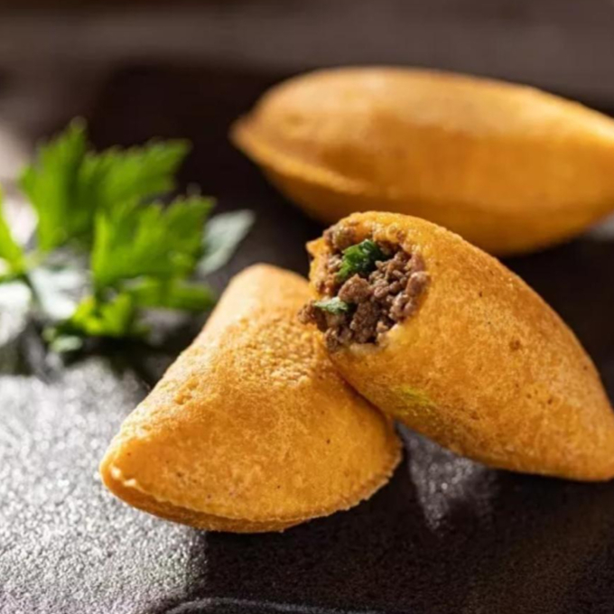 Massa de batata com recheio de carne moída e mussarela empanado na farinha panko sequinho e crocante. Aproximadamente 150g