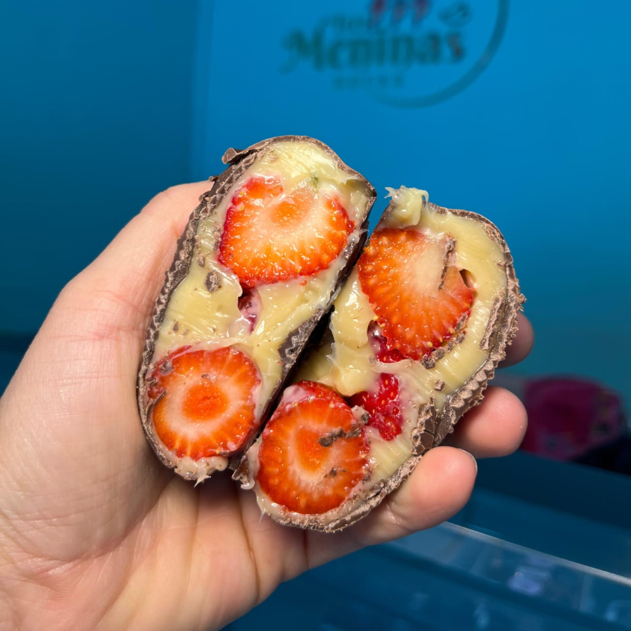 Casquinha de chocolate branco com creme de chocolate branco e geleia Artesanal de morango.