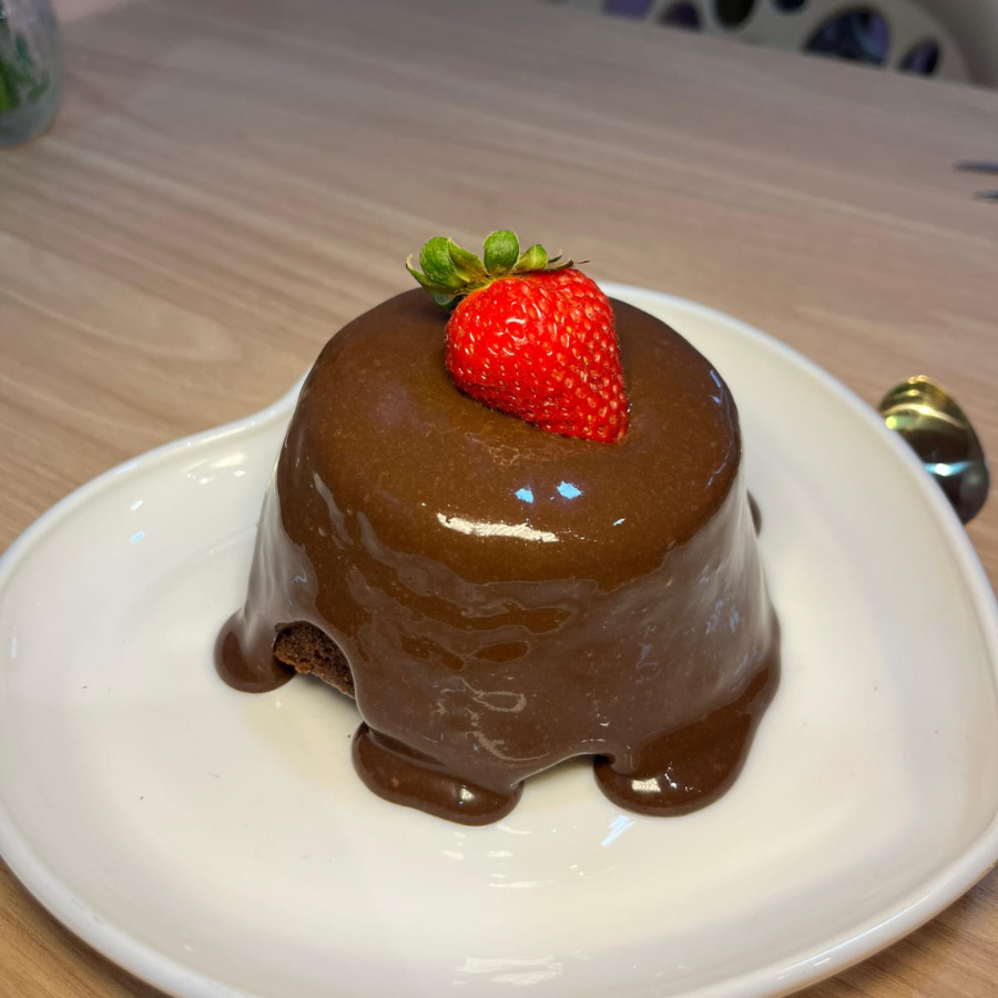 Massa fofinha de chocolate com uma cobertura bem generosa de brigadeiro cremoso no seu interior morangos picados e na finalizaçao um morango suculento. Aproximadamente 250g