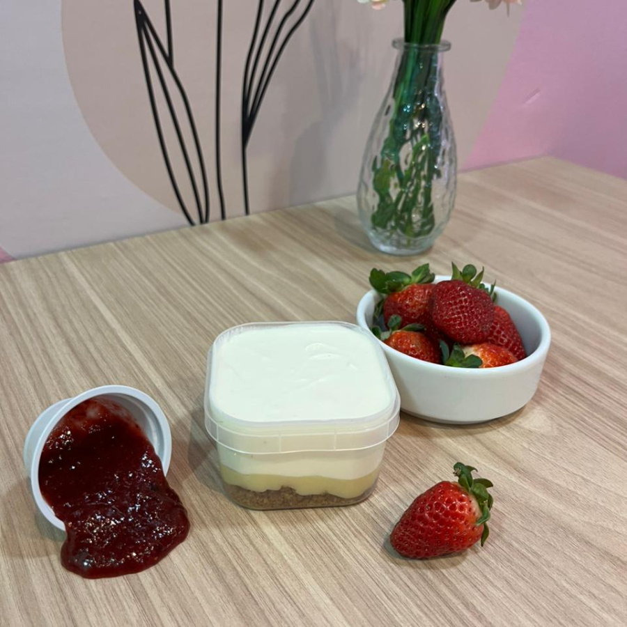Uma farofinha de biscoito amanteigado super crocante, com uma camada de brigadeiro cremoso branco , um creme de cheesecake bem cremoso , acompanha um potinho de geleia de morango para você colocar por cima dessa deliciosa cheesecake . Aproximadamente 150g