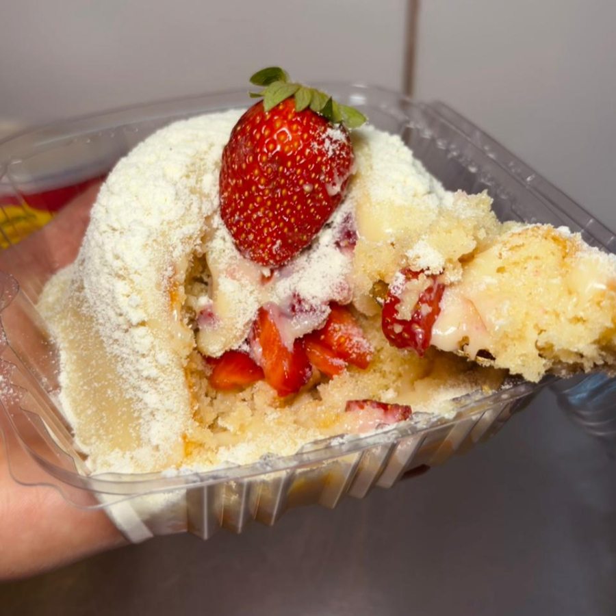 Massa de ninho fofinha, com morangos picados no centro do bolo e uma calda de ninho super cremoso, leite ninho na finalização e morango. Aproximadamente 300g