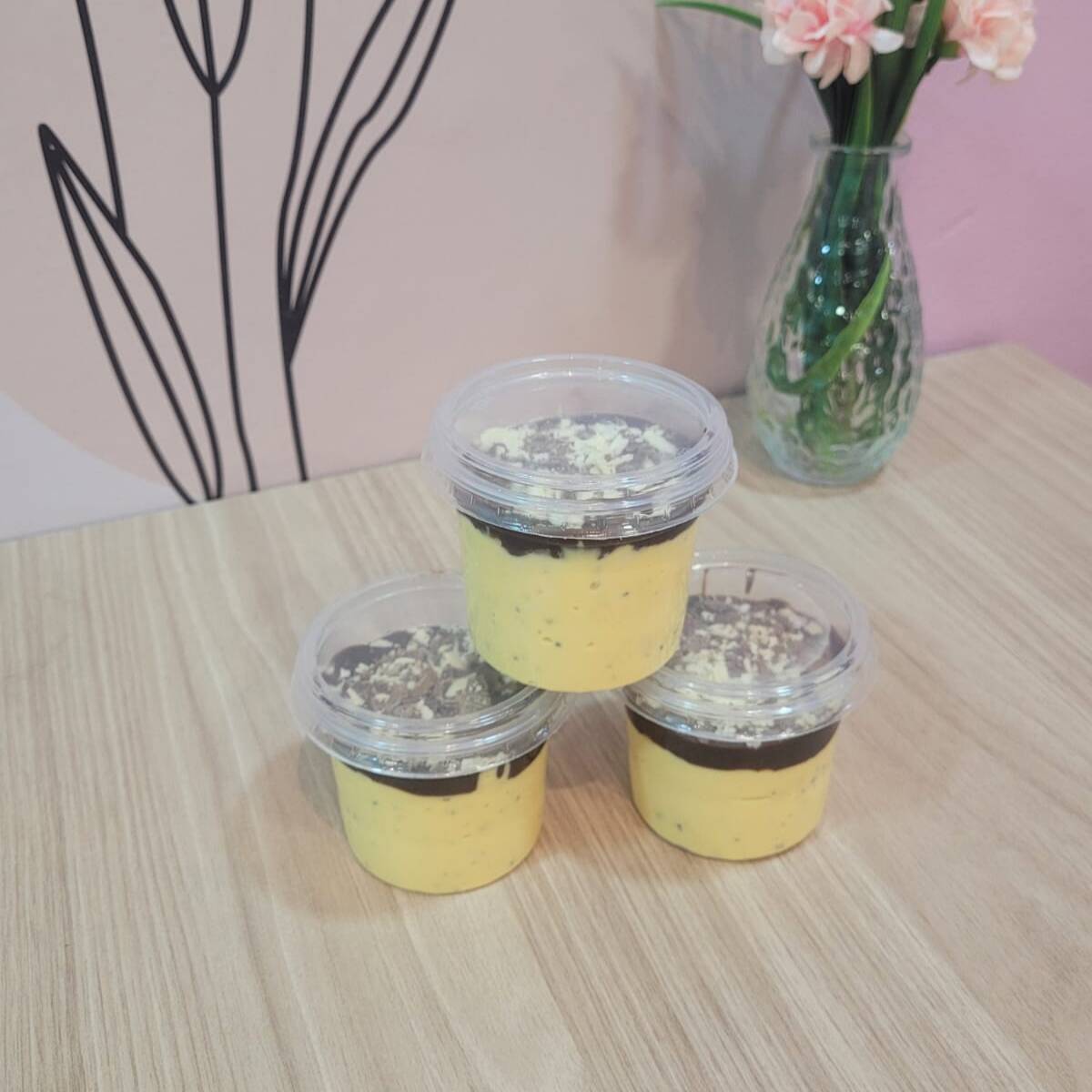 Mousse de maracujá bem cremosa com uma ganache de chocolate blend e raspas de chocolate meio amargo e branco 150g