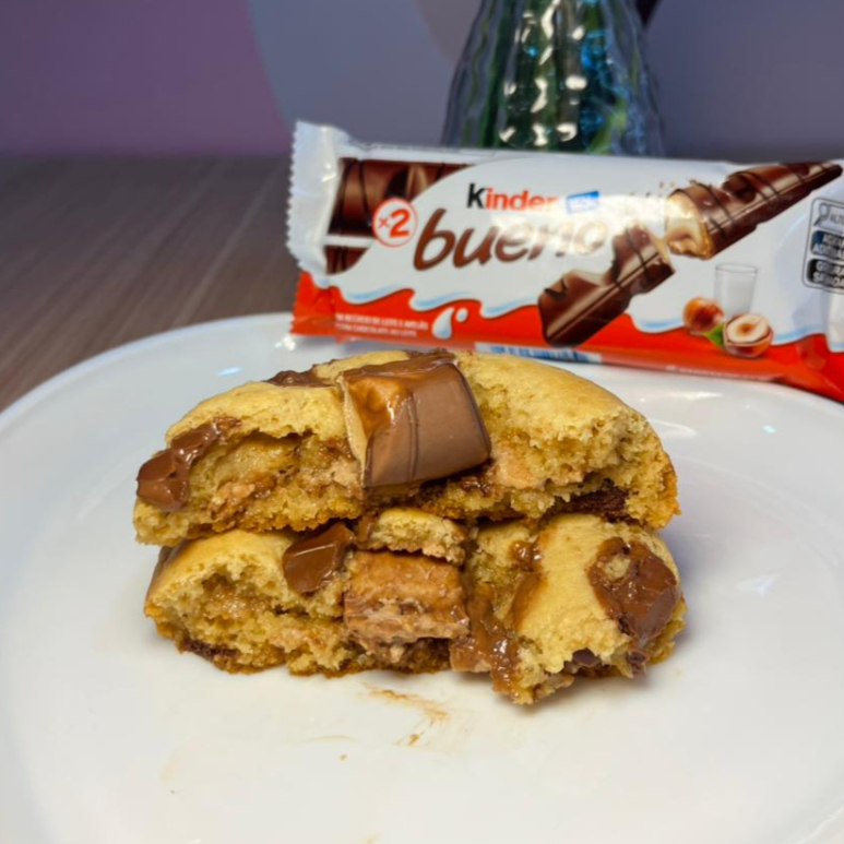Massa cookie tradicional cm pedaços de chocolate ao leite , com recheio cremoso de kinder Bueno e kinder por dentro e finalizado encima Aproximadamente 130g
