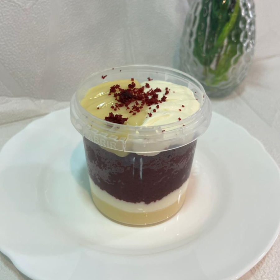 Uma camada de brigadeiro branco cremoso com um mousse de creme cheese massa de bolo red velvet molhadinha , e finalizado cm os dois cremes por cima. Peso 200g