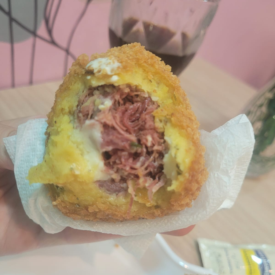 Frita na hora super crocante com uma massa de batata recheio de costela com creme cheese. Aproximadamente 180 g
