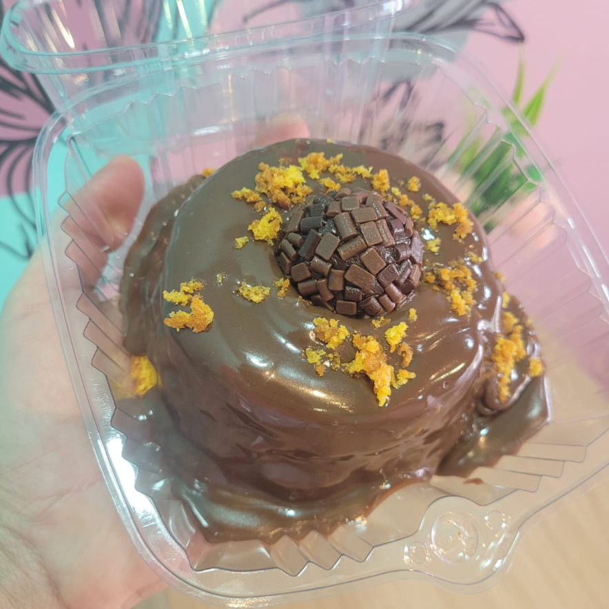 Massa de cenoura fofinha, com uma cobertura cremosa de brigadeiro ao leite suave, finalizado com um brigadeiro por cima. Aproximadamente 300g