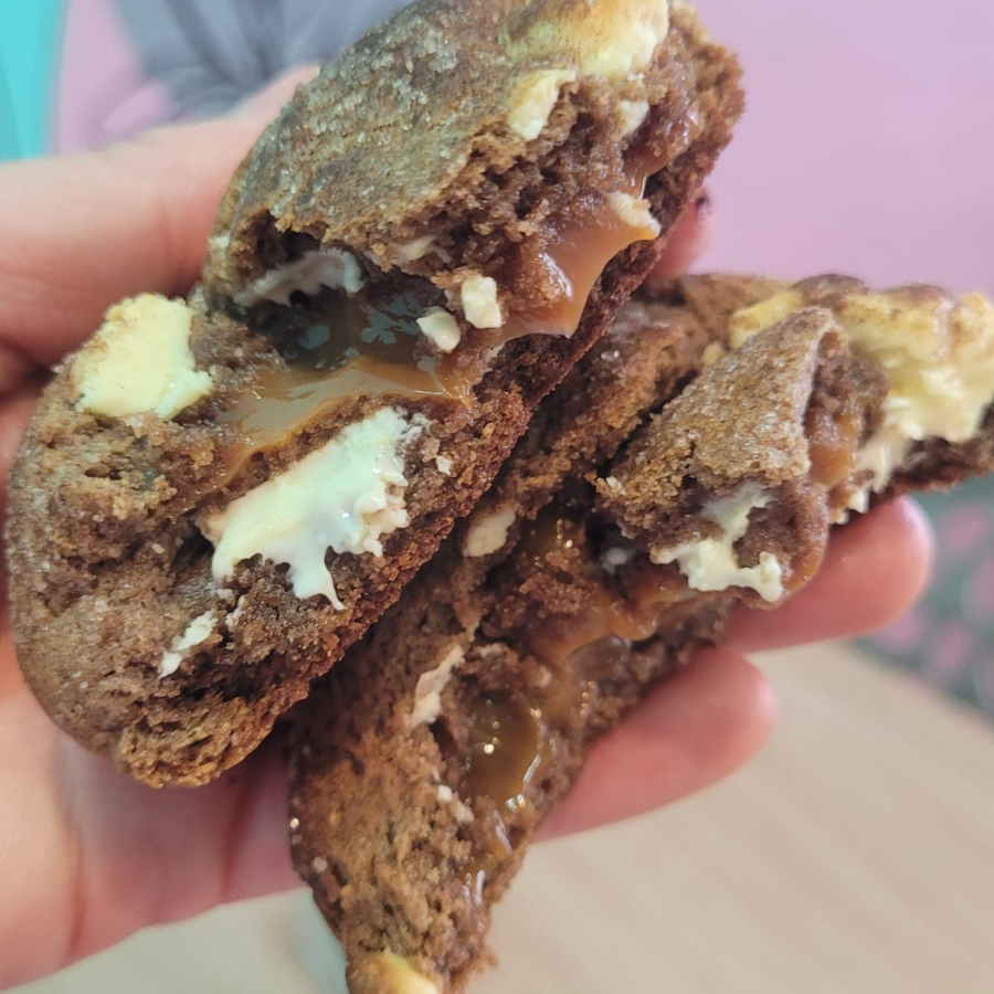 Massa de chocolate intenso 100% cacau , macia o recheio de Stikadinho cremoso escorrendo , e os pedacinhos do doce de morango visíveis . Um abraço doce e nostálgico em formato de cookie! Aproximadamente 130g.
