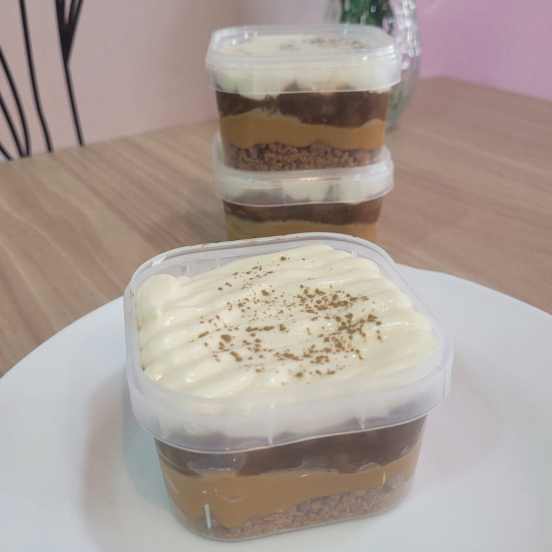 Uma cama de farofa de biscoito amanteigado super crocante com recheio de doce de leite super cremoso , doce de banana e na finalização um chantimousse bem cremoso uma explosão de sabor a cada mordida. Aproximadamente 150g
