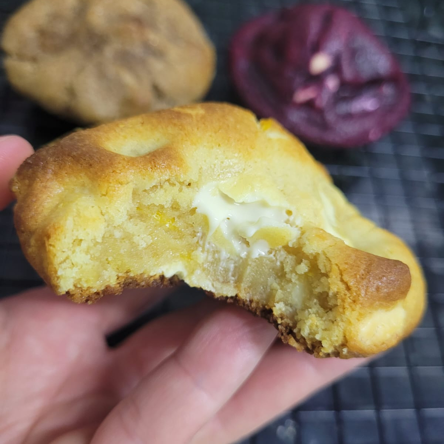 Massa molhadinha com pedaços de chocolate nobre branco e recheio de doce de leite . Aproximadamente 130g .
