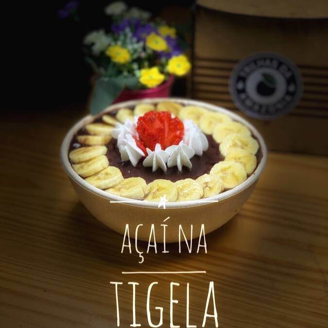 Açaí na tigela contendo em torno 300 ml, batido com banana. Escolha até 5 acompanhamentos.