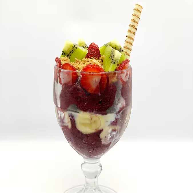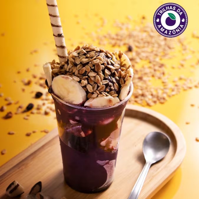 Taça de 500ml com o delicioso açaí da trilhas e inclusos banana, morango, kiwi, leite em pó, leite condensado, paçoca de amendoim, canudo de wafer.