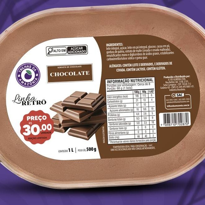 Clássico e irresistível, o nosso Picolé de Chocolate da Linha Retrô é super cremoso e resgata o sabor marcante que fez parte da infância de muita gente. Alérgicos: Contém Leite E Derivados, E Derivados De Cevada. Contém Lactose. Contém Glúten. (Obs: O valor de 5,00 reais, somente em uma Loja Física Trilhas da Amazônia)