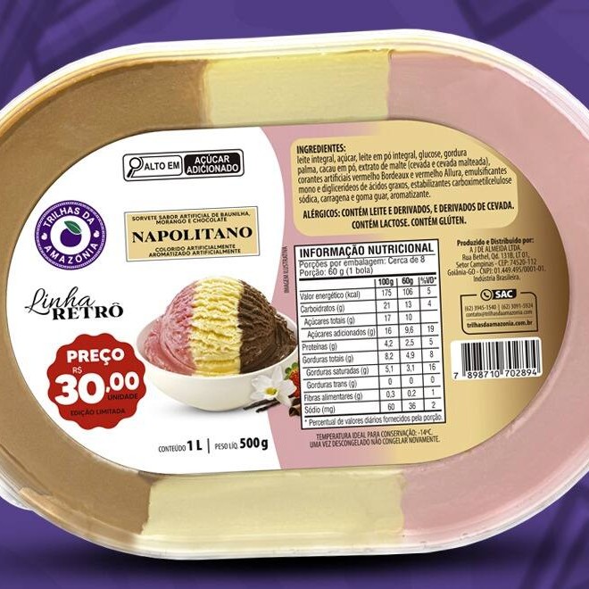 Três sabores clássicos em camadas irresistíveis: baunilha, chocolate e morango. Um sorvete que une famílias e gerações em cada colherada. Alérgicos: Contém Leite E Derivados, E Derivados De Cevada. (Obs: O valor de 30,00 reais, somente em uma Loja Física Trilhas da Amazônia)