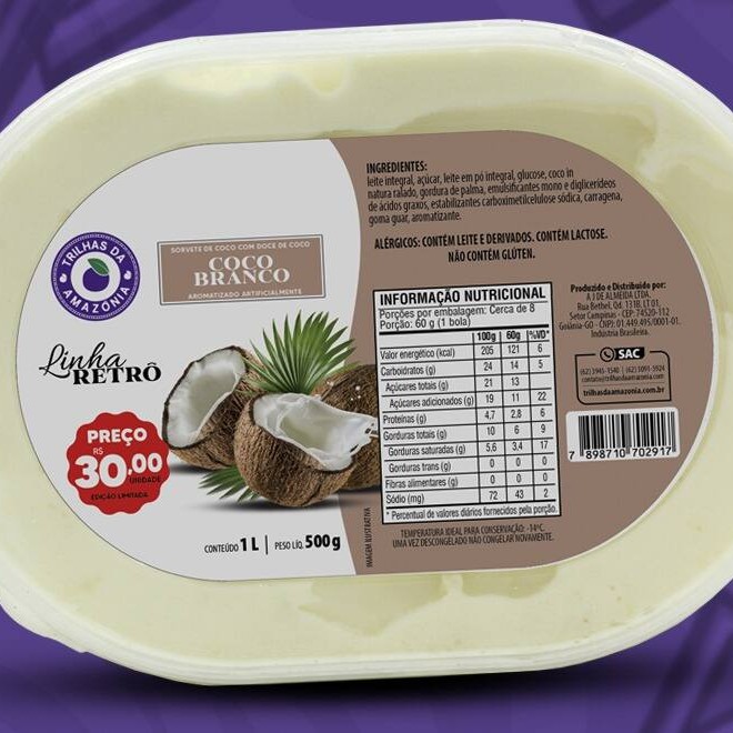 O sorvete Coco Branco faz parte daqueles sabores tradicionais que nunca saem de moda. Alérgicos: Contém Leite E Derivados. (Obs: O valor de 30,00 reais, somente em uma Loja Física Trilhas da Amazônia)