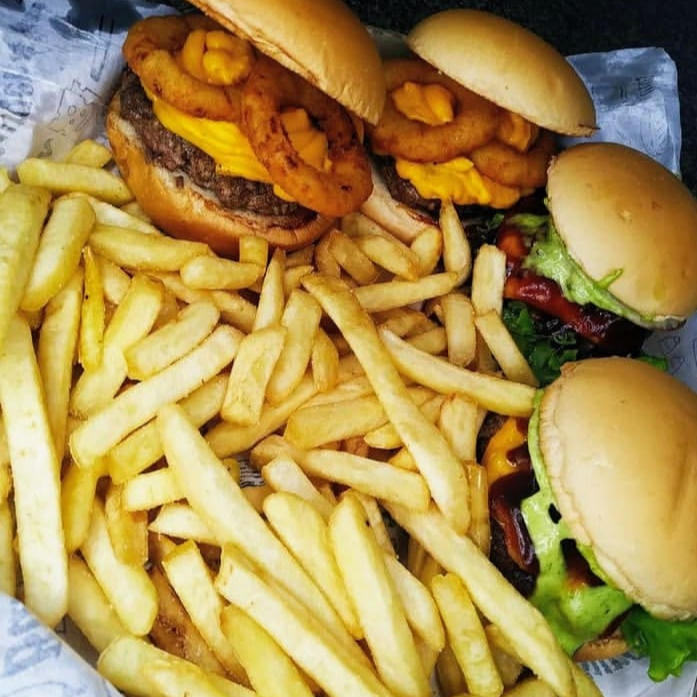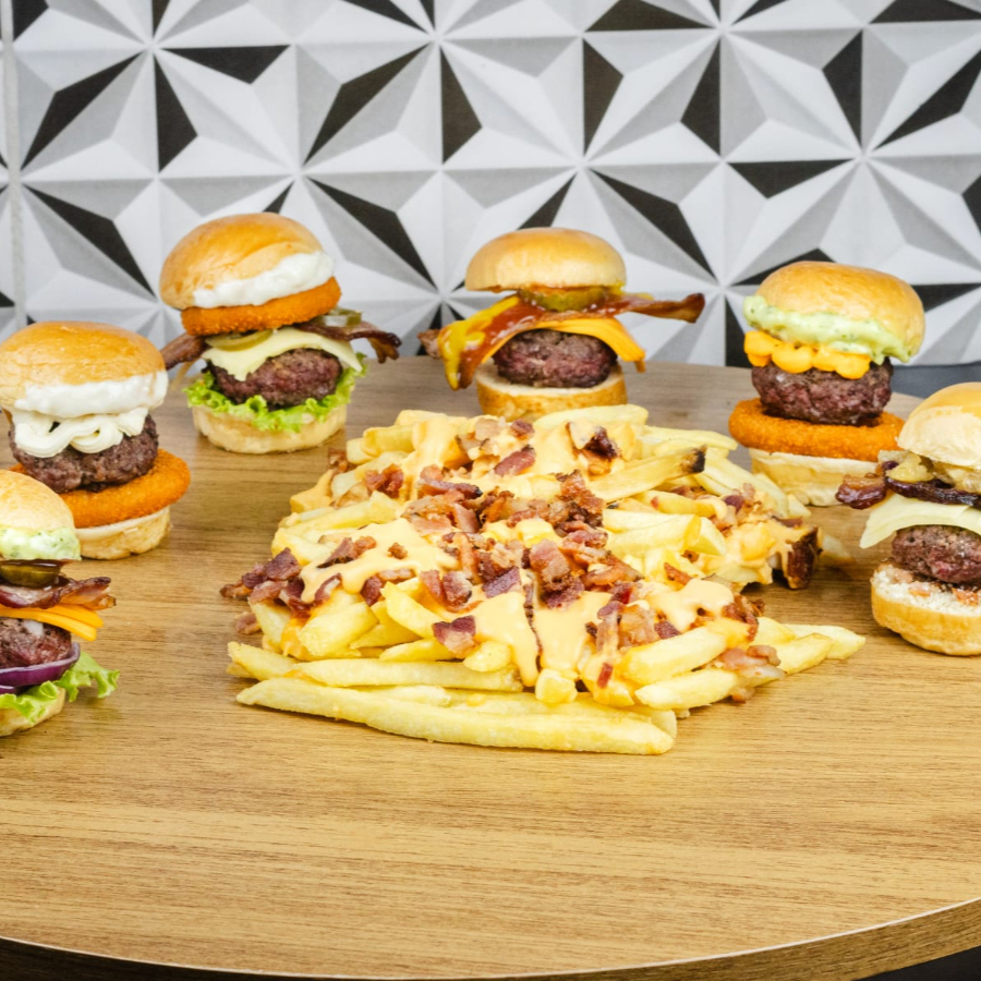 6 MINI HAMBURGUER VARIADOS , 600 GR DE BATATA COM CHEDDAR E BACON , MINEIRO DE 1,5