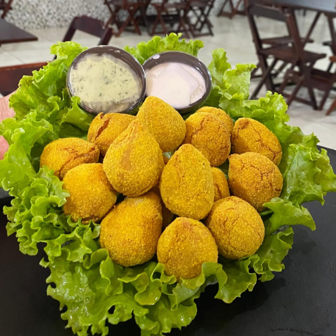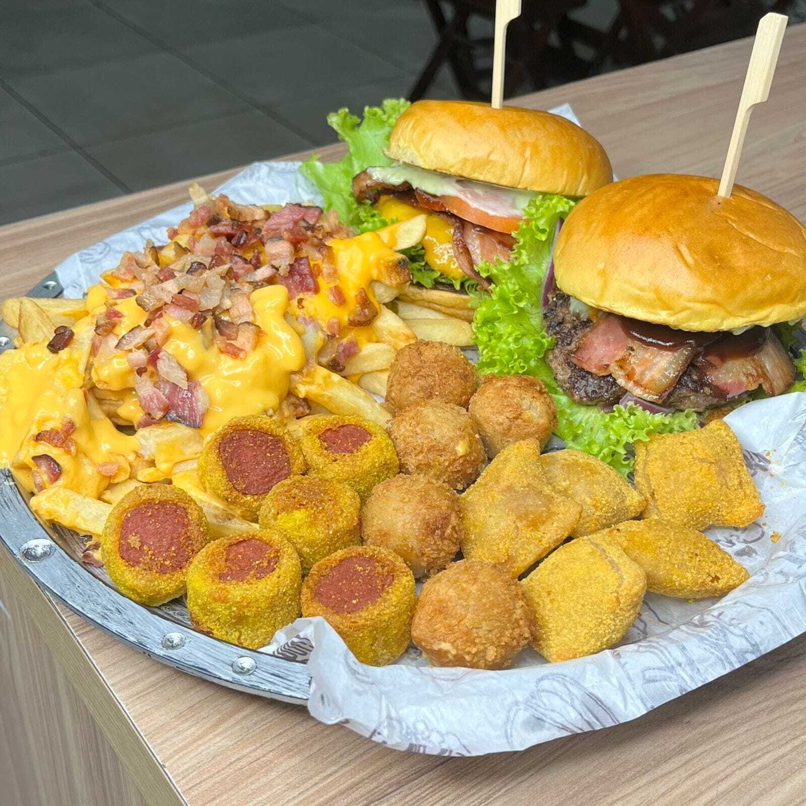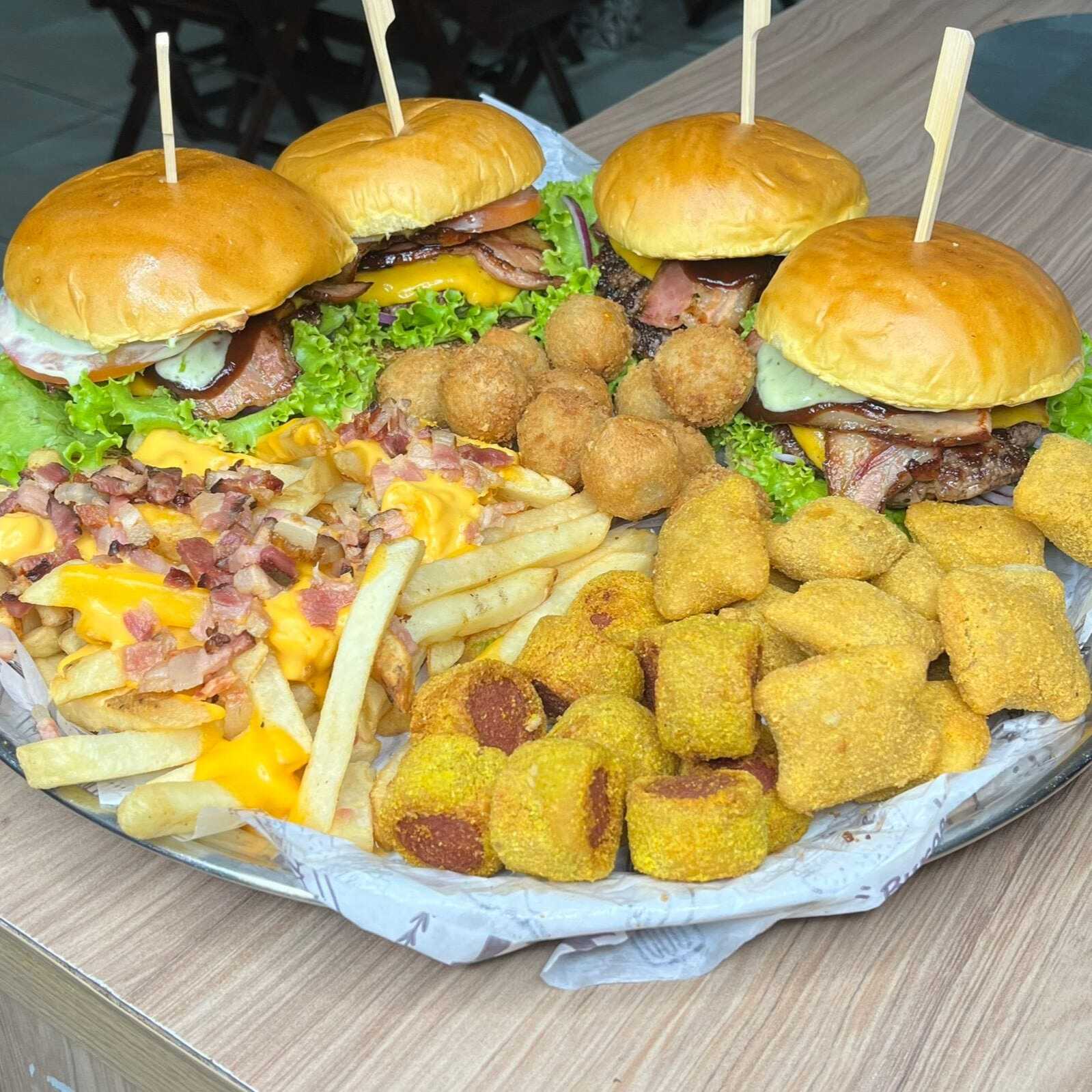 4 BURGUER TROPICAL , 10 BOLINHO DE PIZZA , 10 BOLINHO DE CARNE SECA , 10 ENROLADINHO DE SALSICHA , 600 GR DE BATATA COMPLETA