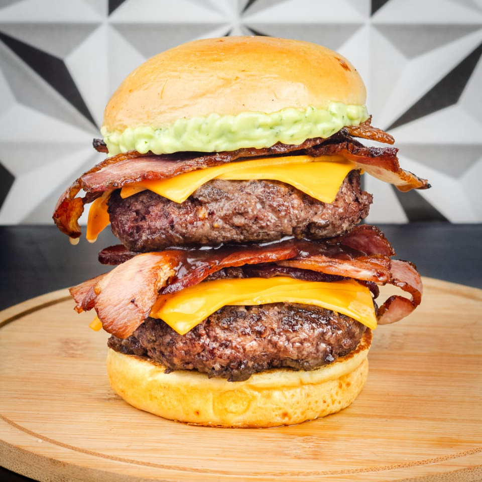 2 HAMBURGER DE 100 GR , DELICIOSO CHEDDER CREMOSO, CEBOLA CARAMELIZADA , MOLHO VERDE