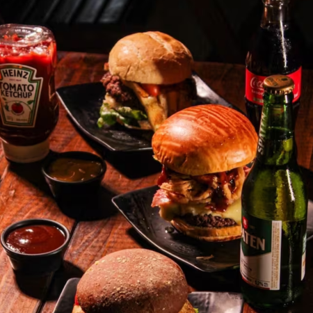 Dois Burgers Liverpool com Hambúrguer 180g, Muçarela, Bacon, Anéis de cebola, Barbecue e Molho da Casa. Dobrando o Sabor do Queridinho da Casa!