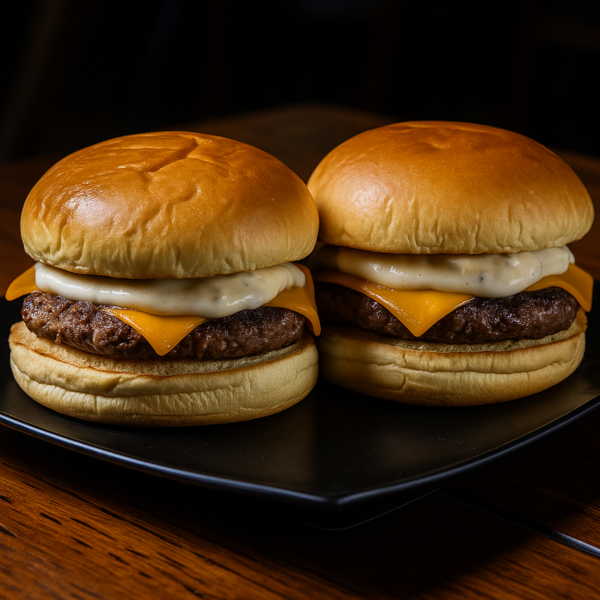 Dois Hambúrgueres 100g com Queijo Derretido e Molho da Casa no Pão Brioche. Promo Irresistível Pra Quem Ama Dobrar o Sabor e Economizar!