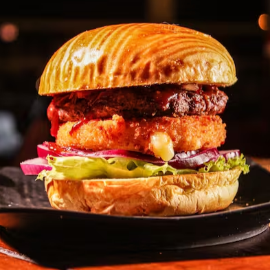 Feito com delicioso blend de fraldinha com peito em 100 Gr, com mussarela empanada, bacon, alface, cebola roxa, molho da casa, molho barbecue e pão brioche