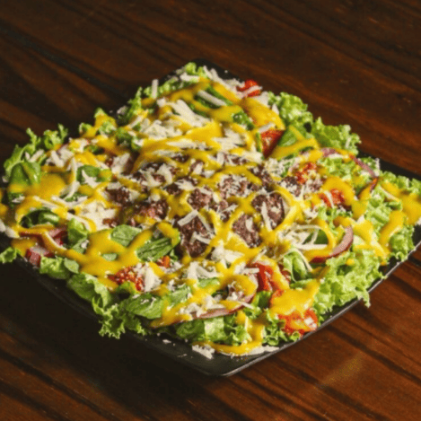 Hamburguer à escolha em cama de alface americana, rúcula, tomate confit, cebola roxa, parmesão e molho mostarda e mel