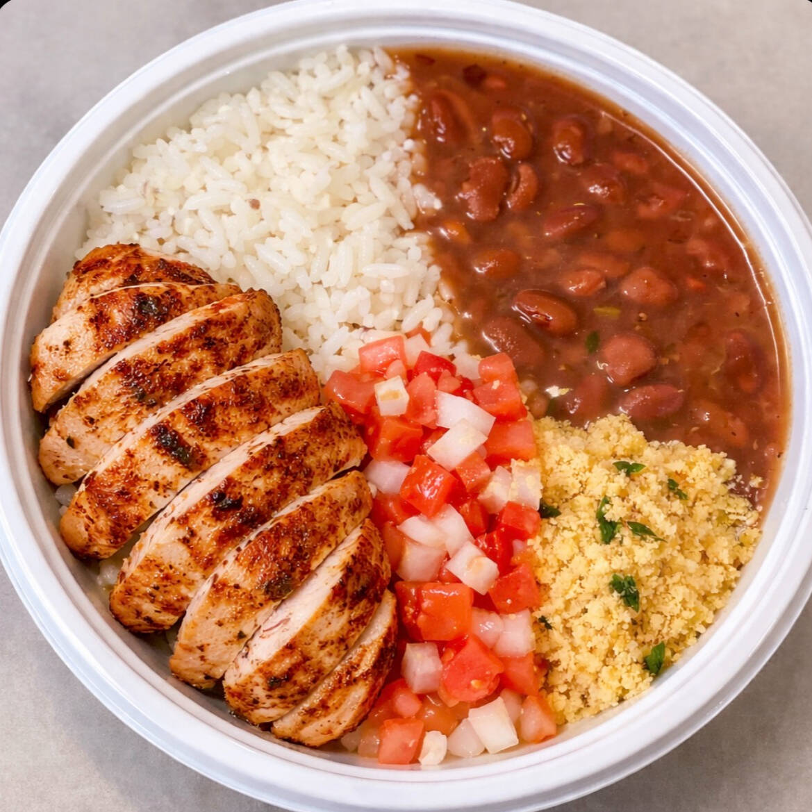 Marmitex acompanha ARROZ BRANCO, FEIJÃO DE CALDO, FRANGO GRELHADO, FAROFINHA E VINAGRETE.