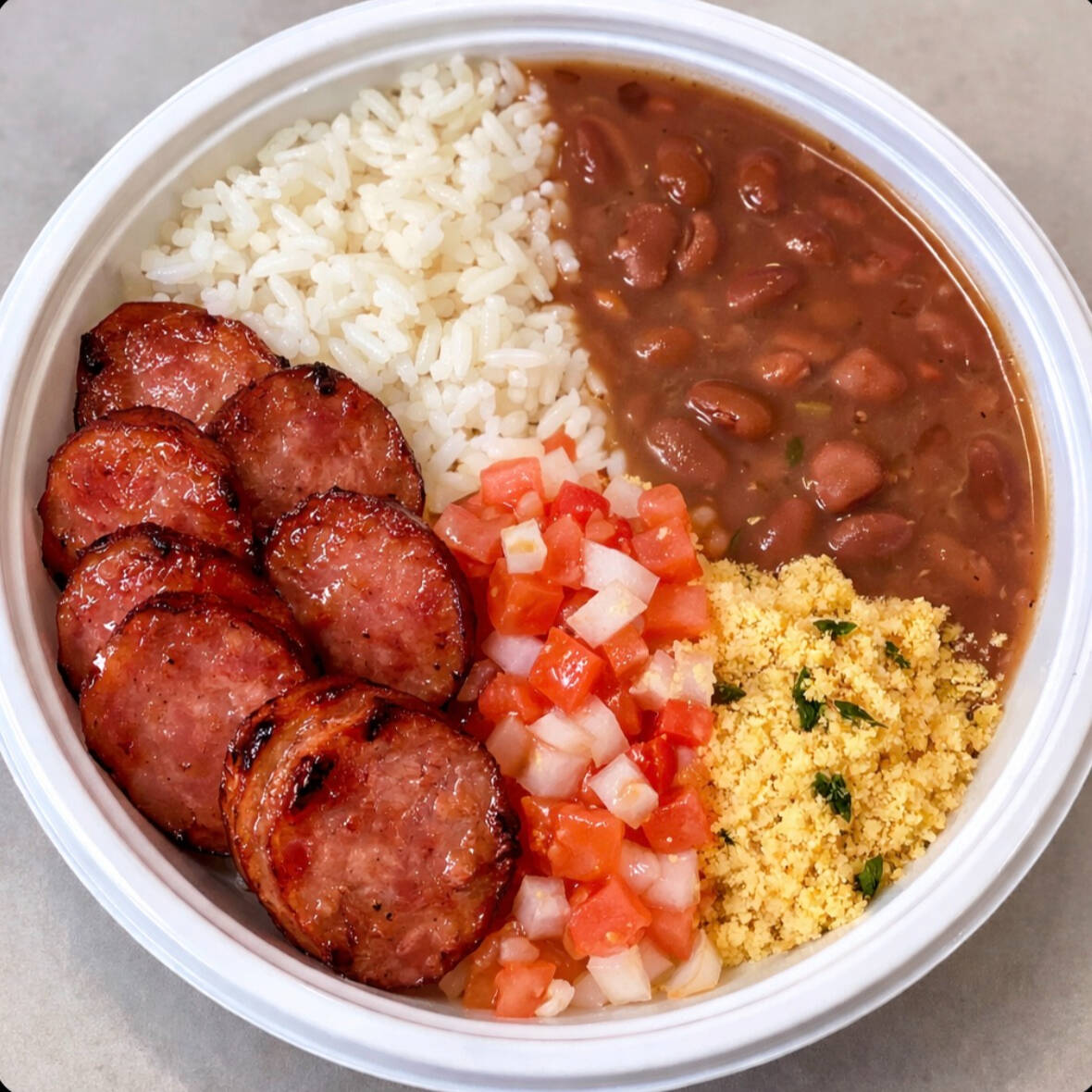 Marmitex acompanha ARROZ BRANCO, FEIJÃO DE CALDO, LINGUIÇA PERDIGÃO ASSADA NA BRASA, FAROFINHA E VINAGRETE.