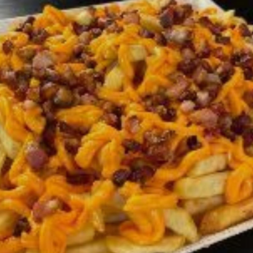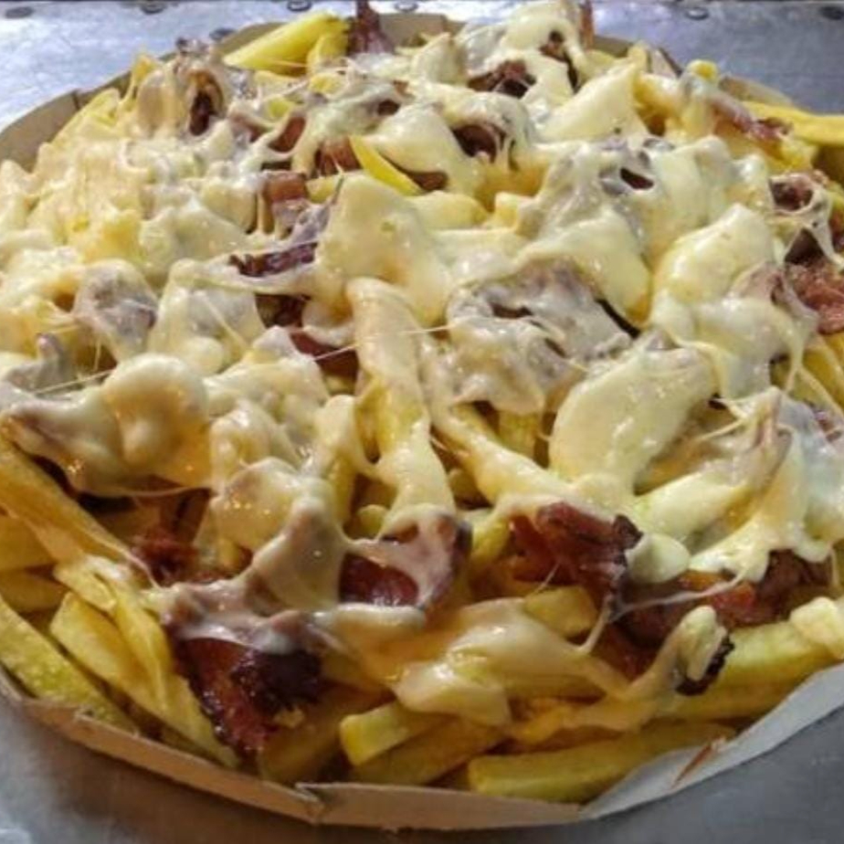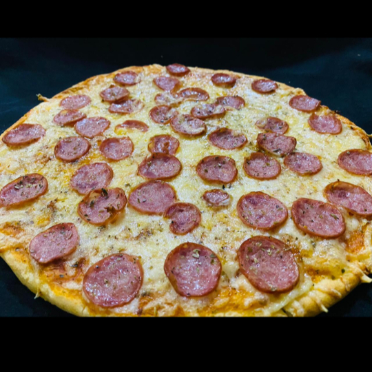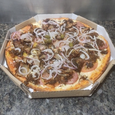 Macarrão espaguete, molho bolonhesa e molho branco, bacon, frango, presunto, milho, calabresa picadinha, mussarela e orégano.