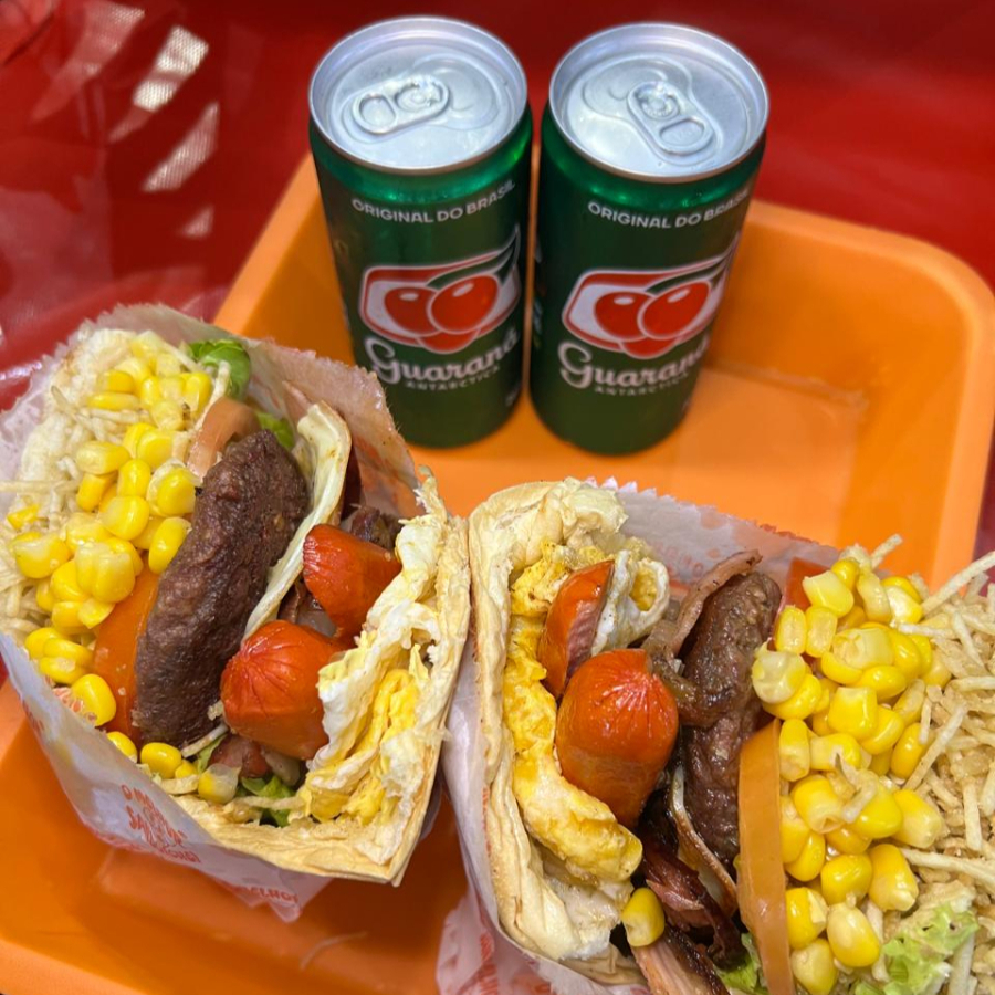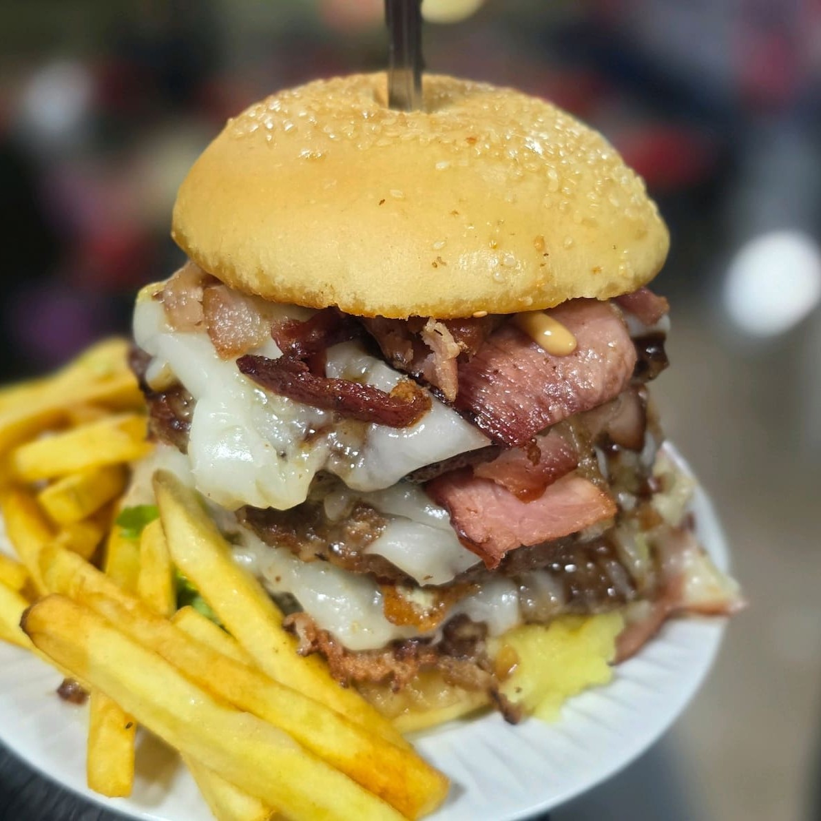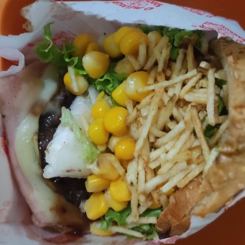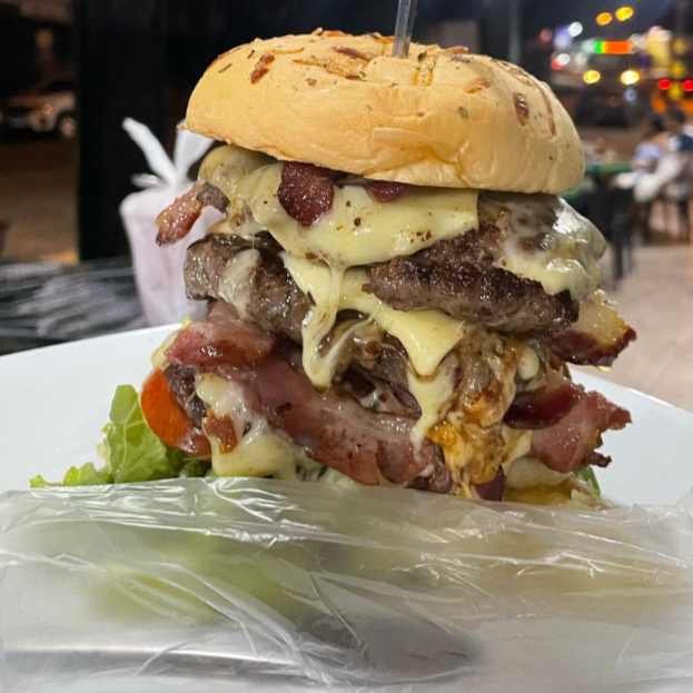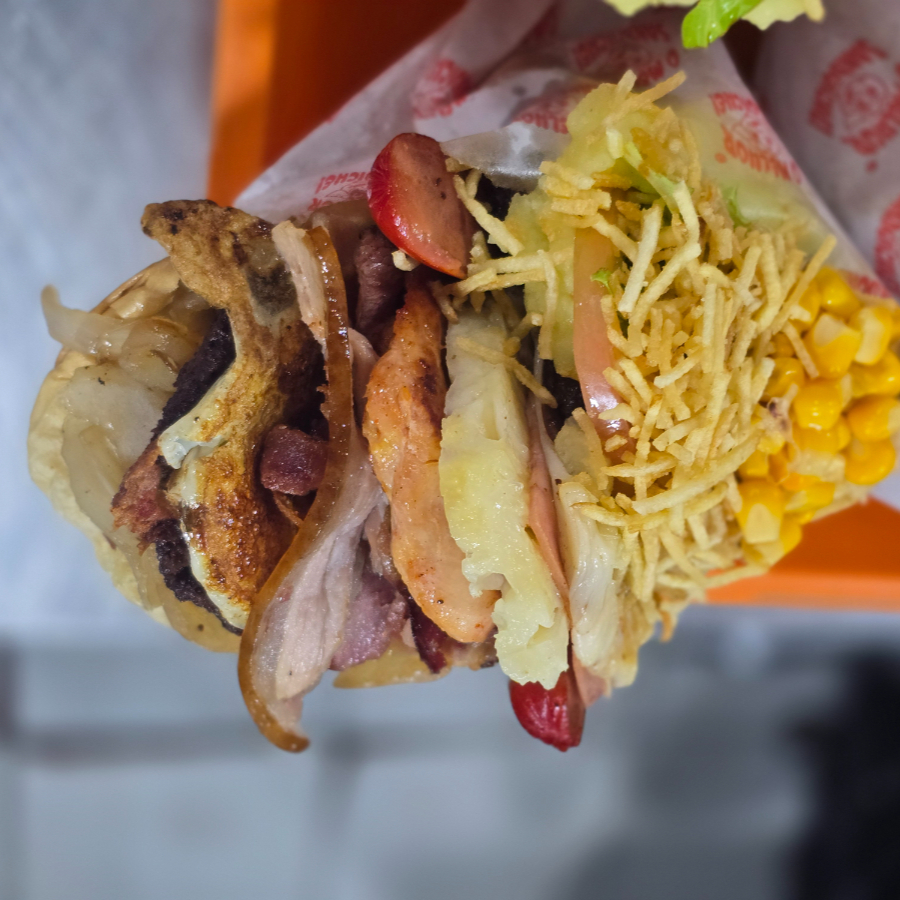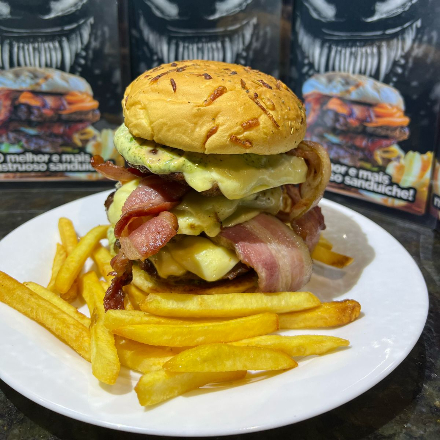 Pão, hambúrguer 150 g, lombo, frango, mussarela, bacon, ovo, salsicha, batata e milho. Um verdadeiro monstro de sabor.