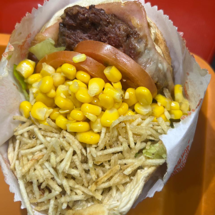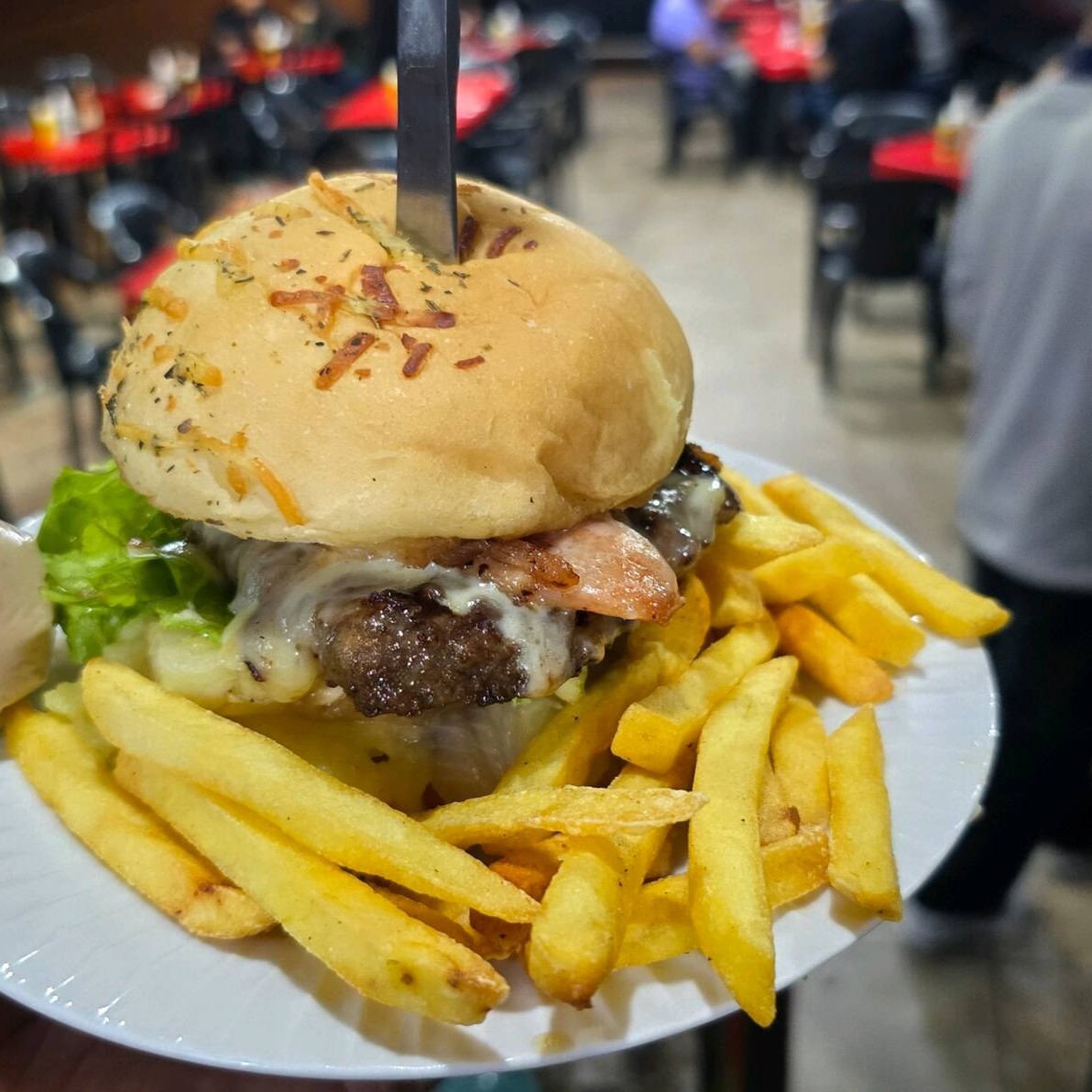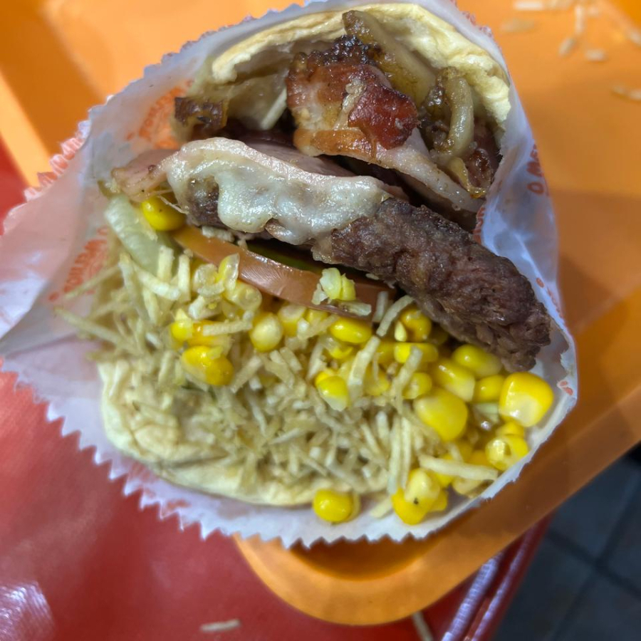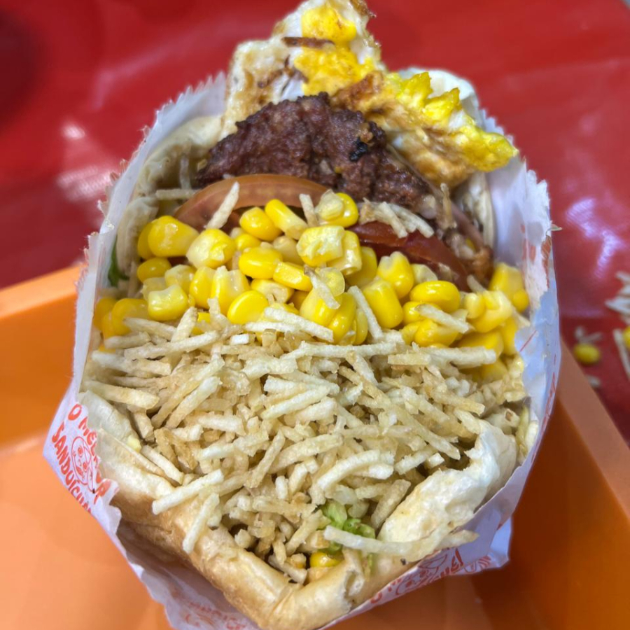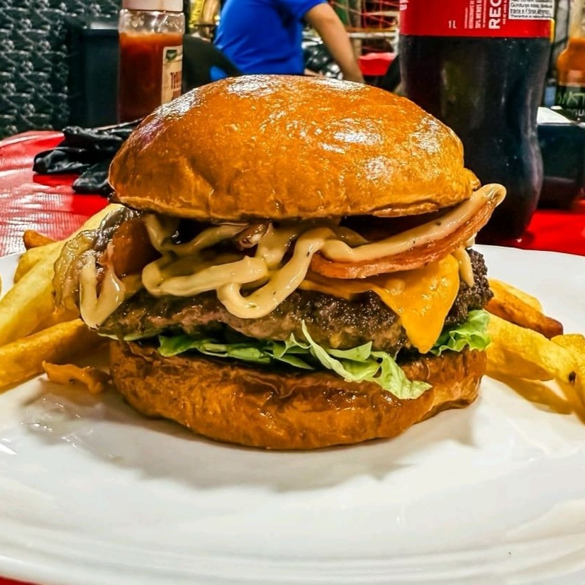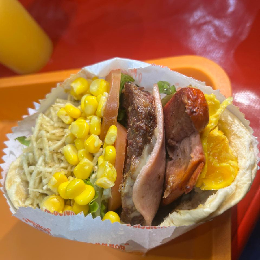 Pão, hambúrguer 150 g, lombo, frango, mussarela, bacon, ovo, salsicha, batata e milho. Um verdadeiro monstro de sabor.