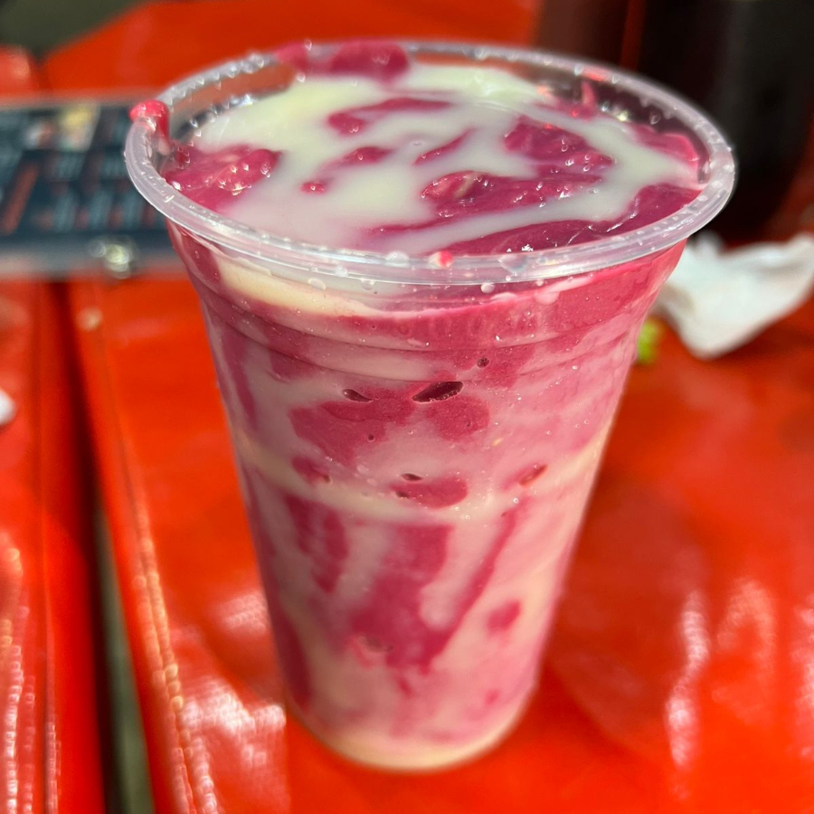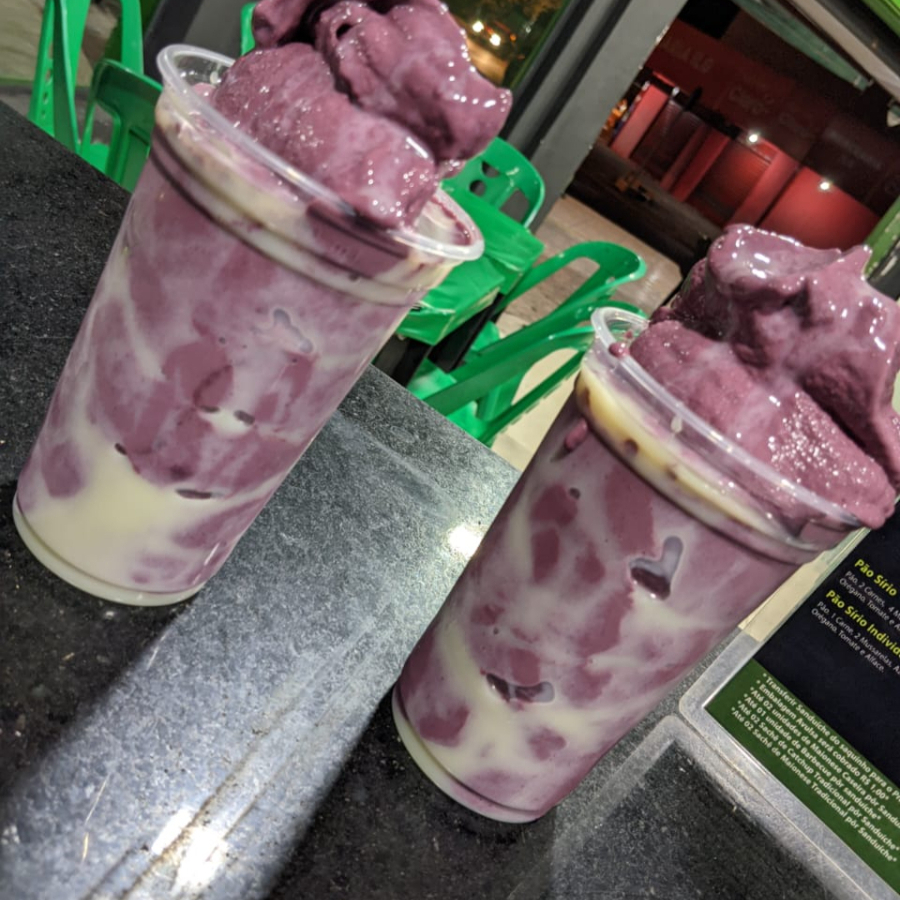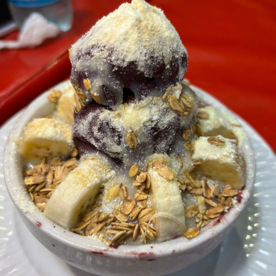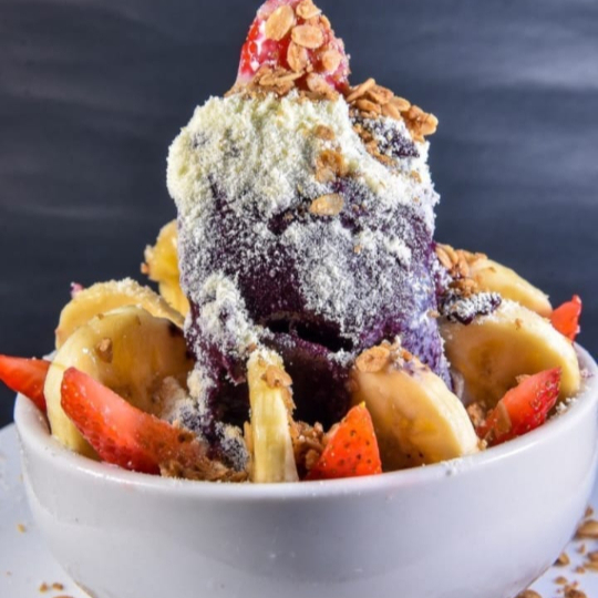 Açaí, xarope de guaraná, banana, granola, leite em pó, farinha láctea e leite condensado.