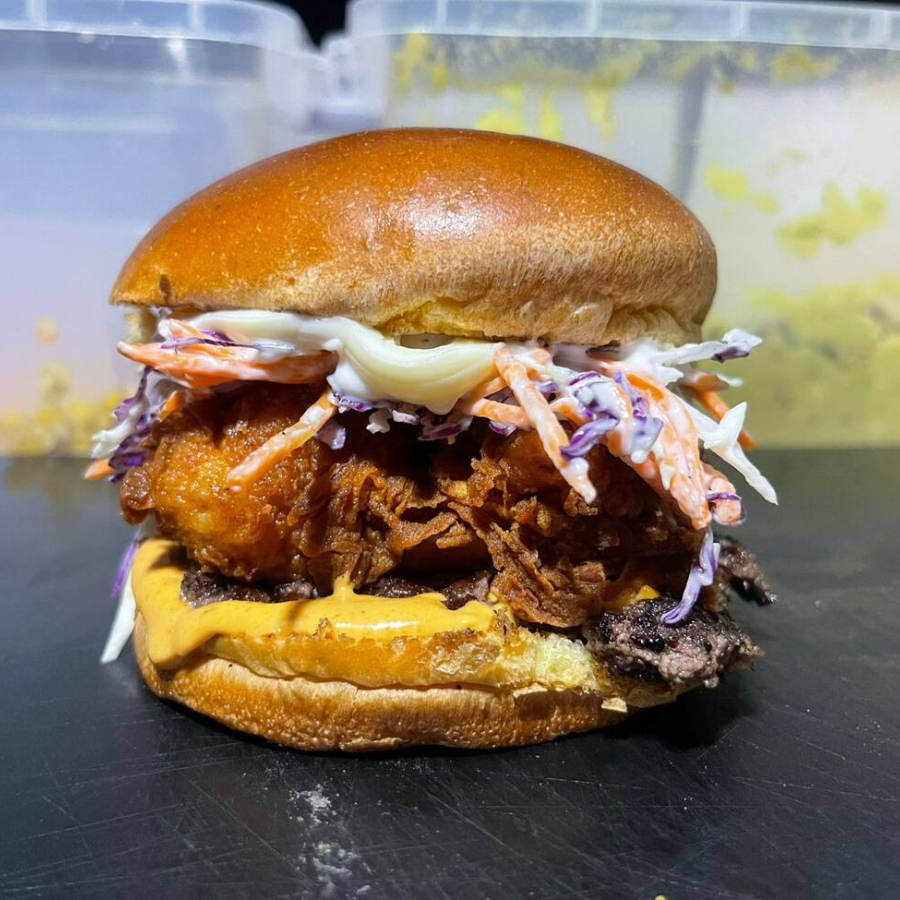 Pão brioche, carne smash, cheddar, frango frito crocante com sweet chilli, coleslaw refrescante, sour cream e jalapeño.