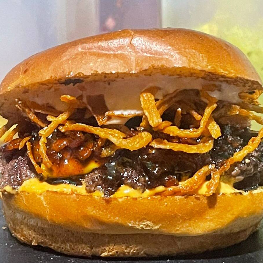 Pão brioche, duas carnes smash, cheddar, geleia de bacon e cebola crispy.
