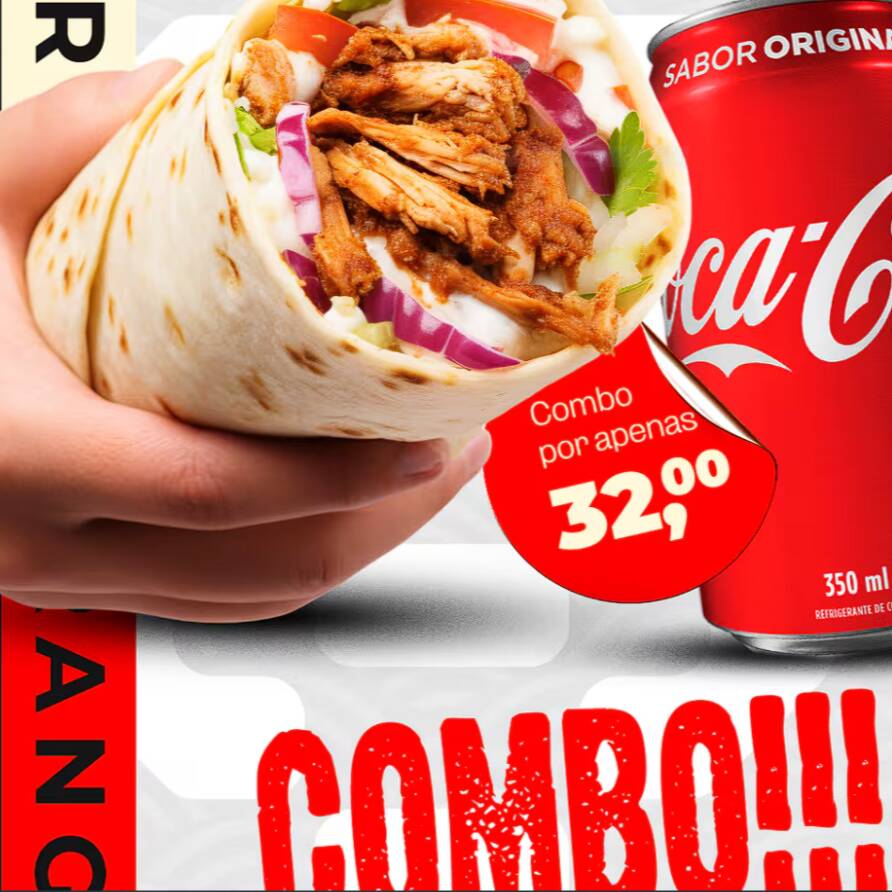 Frango grelhado suculento + queijo mussarela + chilli da casa + guacamole fresca + mix crocante de cenoura e repolho + folhas + milho + sour cream + molho cheddar + salsa vermelha + Coca-Cola Lata 350ml