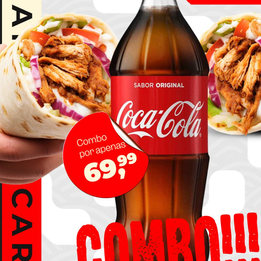 Frango grelhado suculento + queijo mussarela + chilli da casa + guacamole fresca + mix crocante de cenoura e repolho + folhas + milho + sour cream + molho cheddar + salsa vermelha + Coca-Cola 1lt