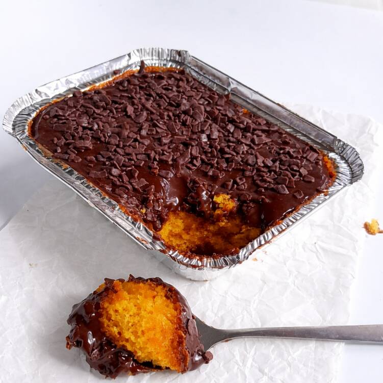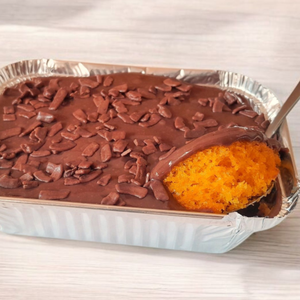 Bolo de cenoura fofinho, coberto por uma calda de brigadeiro 50% cacau e finalizado com granulados. Agora em um tamanho maior, feito na marmita de 500ml, Peso aprox: 270g